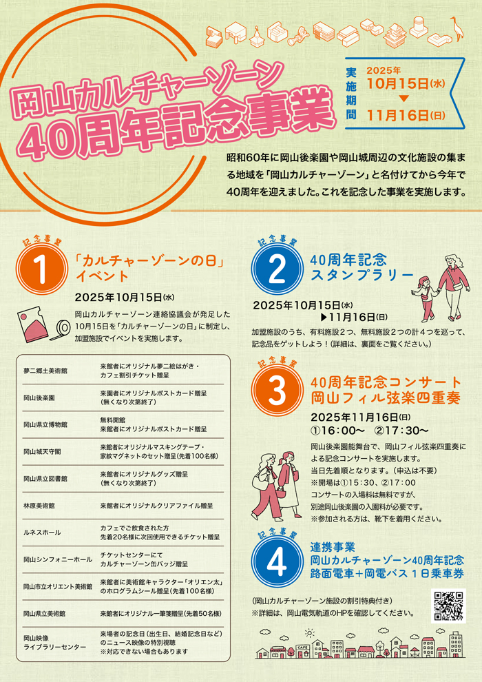 【スタンプラリー】 加盟施設のうち、有料施設2つ、無料施設2つの計4つを巡って、記念品をゲットしよう! 【4 0周年記念コンサート岡山フィル弦楽四重奏】 2025年11月16日(日) ①16:00~ ②17:30~ 岡山後楽園能舞台で、岡山フィル弦楽四重奏による記念コンサートを実施します。 当日先着順となります。(申込は不要) ※開場は①15:30、②17:00 コンサートの入場料は無料ですが、別途岡山後楽園の入園料が必要です。 ※参加される方は、靴下を着用ください。 ※詳細は、下記の「PDFはこちら」からご確認ください。 |