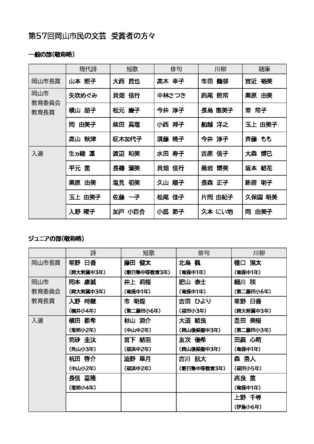 おしらせ 第57回「岡山市民の文芸」受賞者が決定しました。